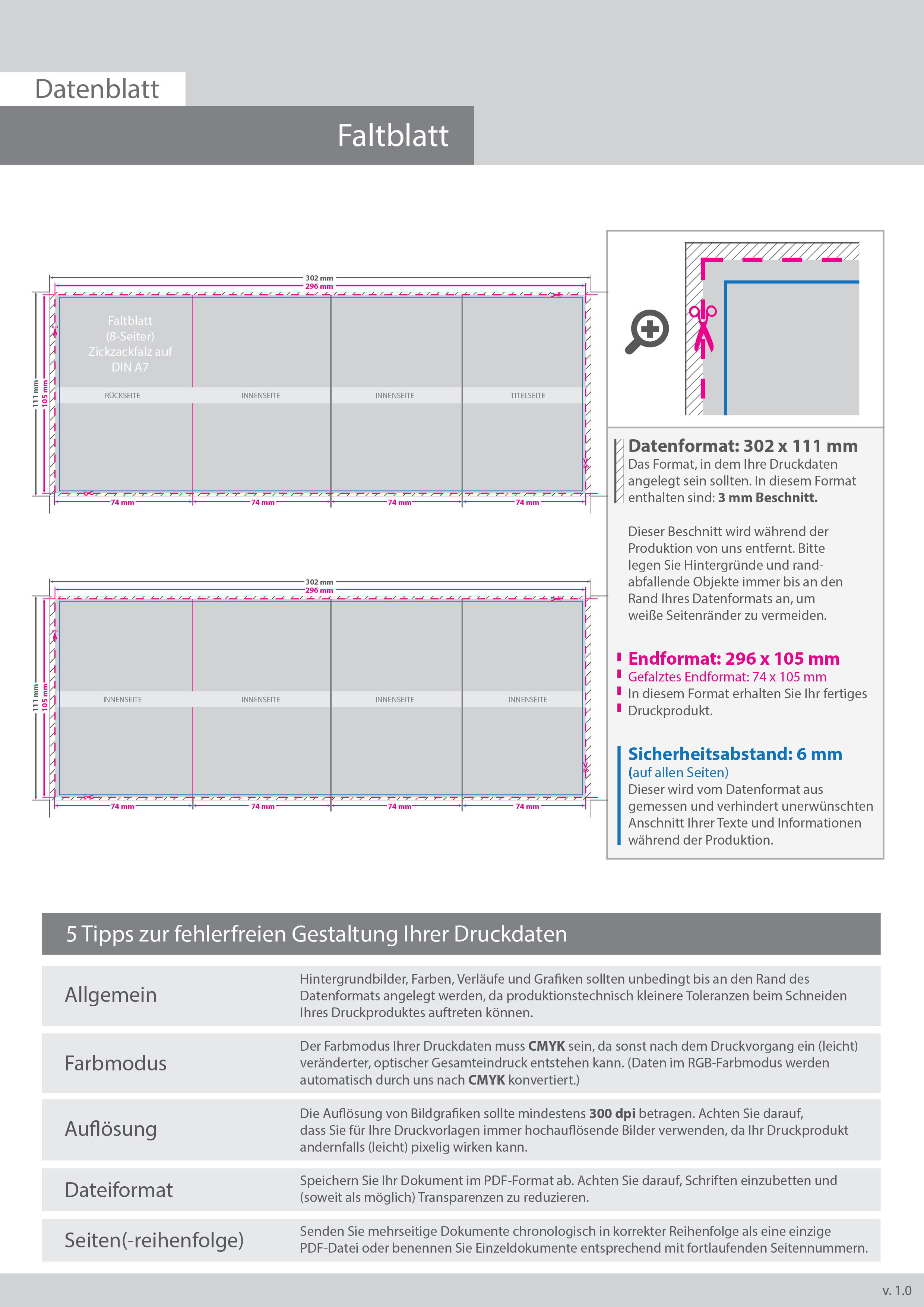 Faltblatt, gefalzt auf DIN A7, 8-seiter (Zickzackfalz)