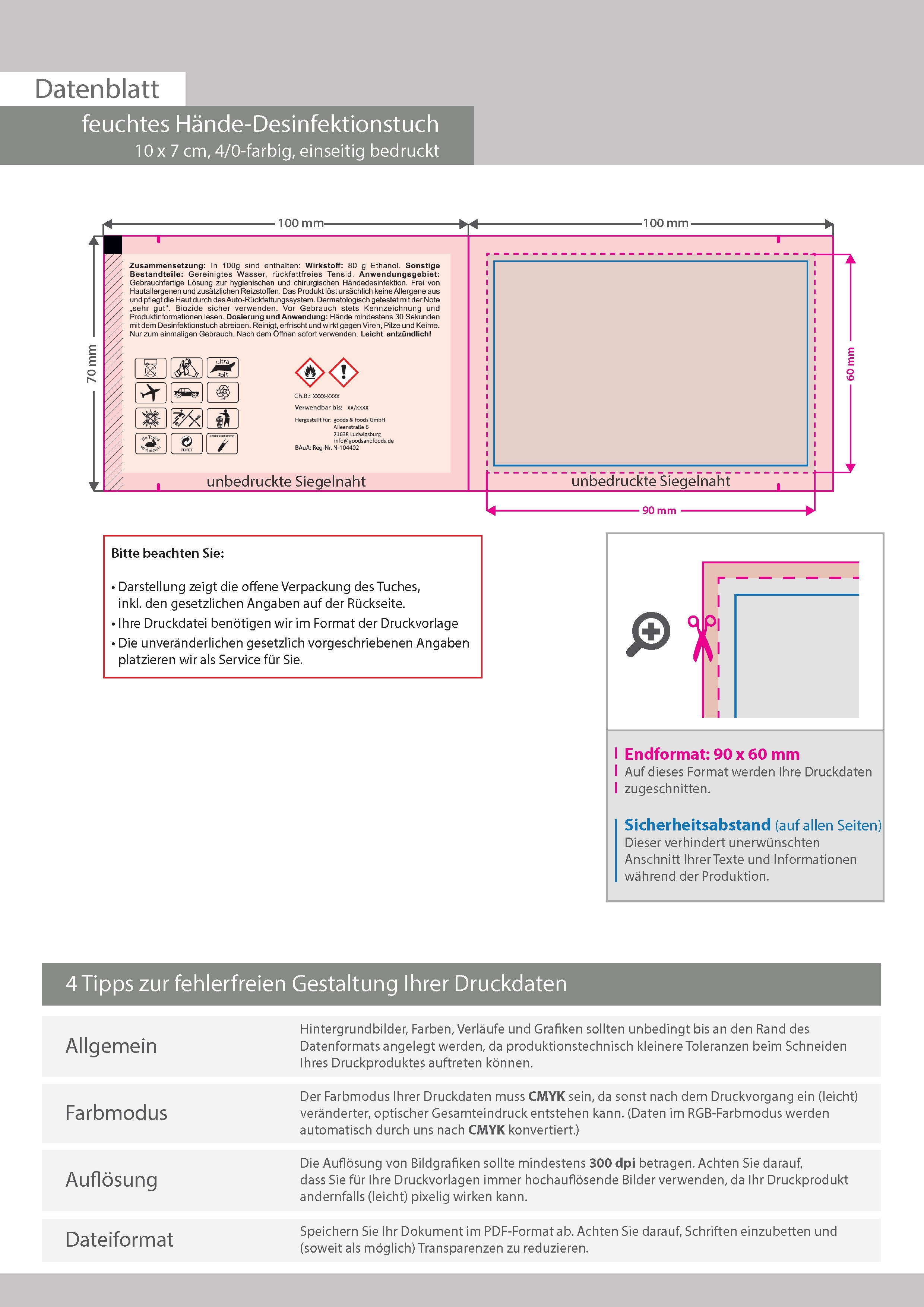 Hände-Desinfektionstuch, 10 x 7 cm, 4/0-farbig einseitig bedruckt